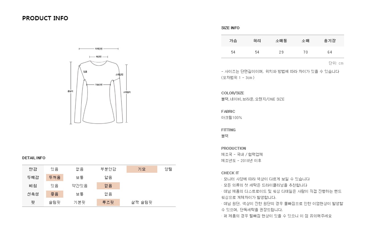 모델(키:164)이 착용했을때 힙을 덮는 기장감이였어요