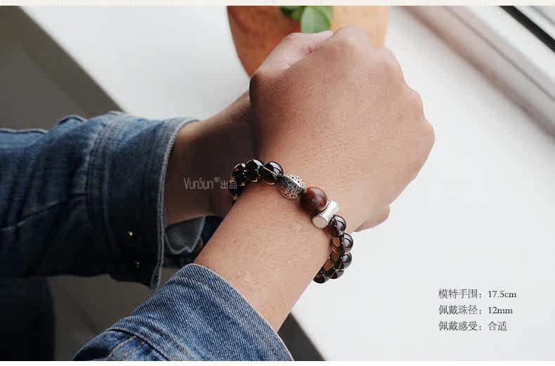 天然茶水晶手链男款 单圈茶晶银木质手串简约个性文艺饰品