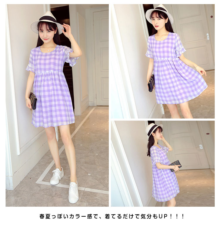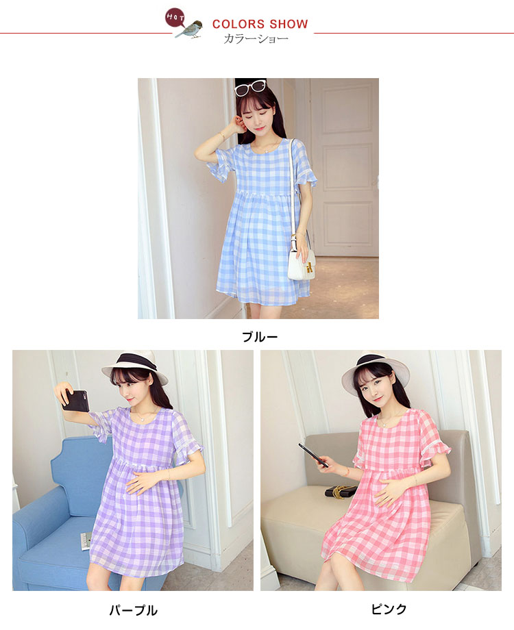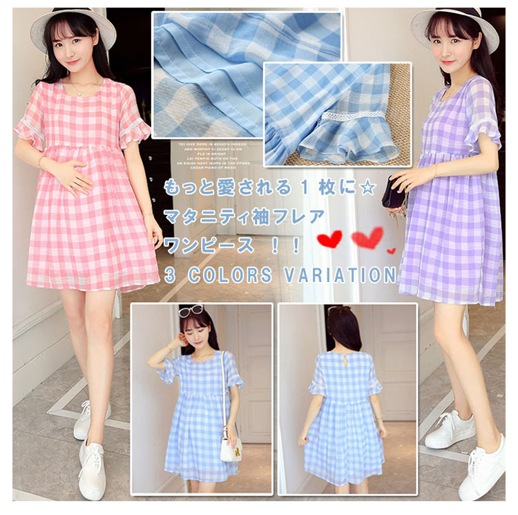 | もっと愛される1枚に☆マタニティ 袖フレアワンピース !! ウエストラインで切り替えて前後にギャザーを入れたデザインは、全体的にゆったりフィットだから、マタニティウェアとしても着れちゃいます!! 春夏っぽいカラー感で、着てるだけで気分もUP!!! | |