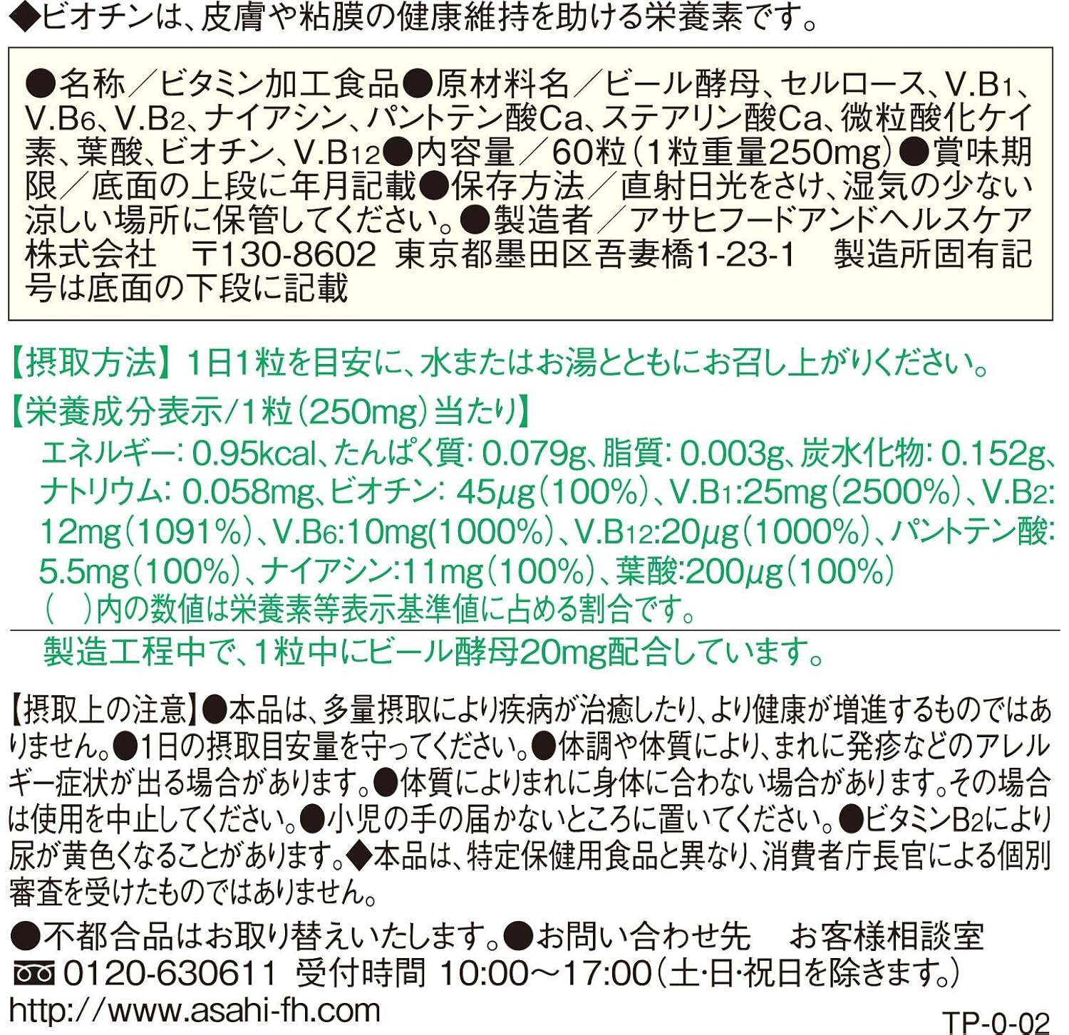 原材料 : ビール酵母、セルロース、V.B1、V.B6、V.B2、ナイアシン、パントテン酸Ca、ステアリン酸Ca、微粒酸化ケイ素、葉酸、ビオチン、V.B12