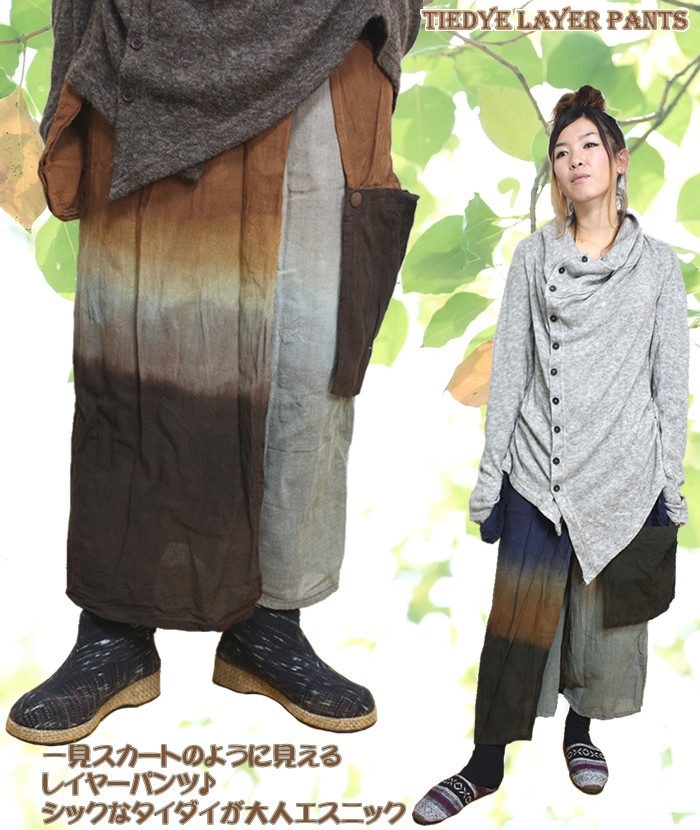 ○素材:コットン後ろから見るとスカート!前から見るとパンツ!レイヤーデザインがお洒落度を一気にUP♪シックな色合いのタイダイはこれ一着でしっかり大人エスニックを作り出してくれます。両サイドについたデザイン違いの大きなポケットもアクセントに♪ウエストは総ゴムなので楽チン♪カラーは3色(ネイビー系・ブラウン系・カーキ系)Sizeウエスト幅:約32cm~50cm(総ゴム)総丈:約80cm股下:約53cm○素材:コットン
