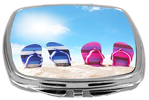 Rikki Knight Pair of Pink and Blue Striped Flip Flops in Sand on Summer Beach Design Compact Mirror, 17 Ounce