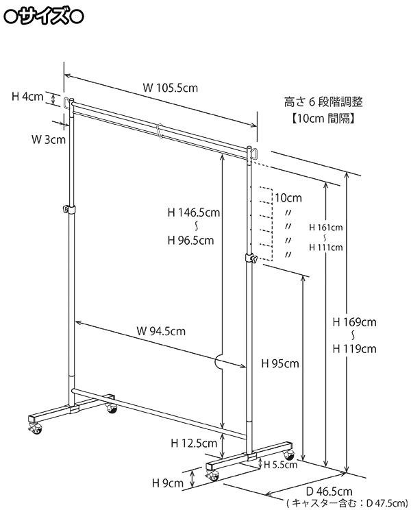 | サイズ | W105.5×D47.5×H119~169cm(キャスター含む) 個装サイズ:110×21×8cm |