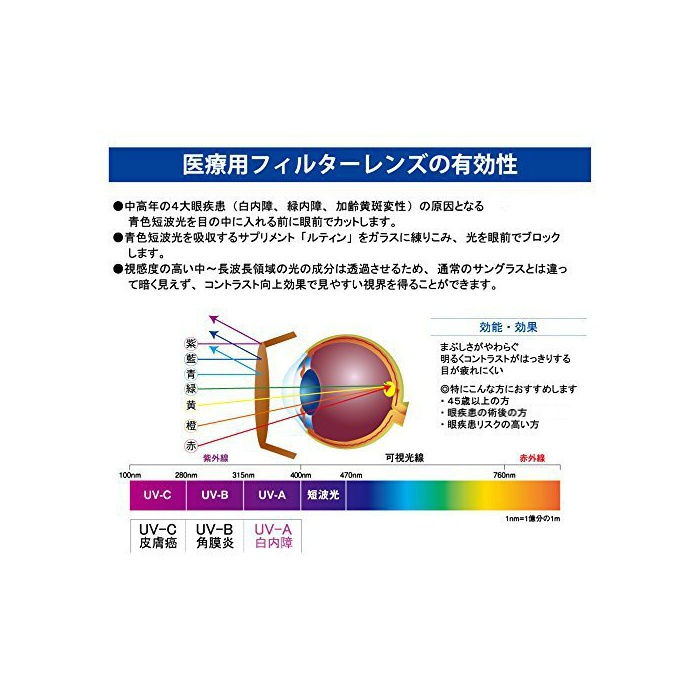 특히 백내장을 비롯한 안질환 수술 후의 썬글라스에 최적입니다.또한PC나 게임을 했을 때의 피로 눈(째) 대책 안경으로서,중노년 특유의 눈부심을 느끼는 분에 장려합니다.안정피로를 억제합니다.