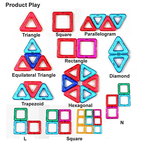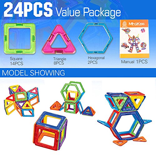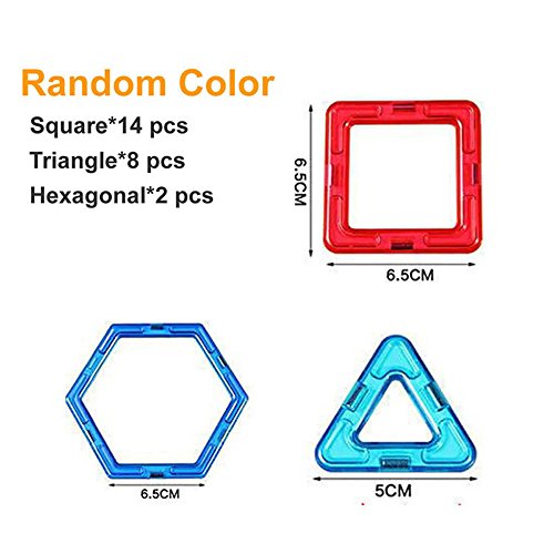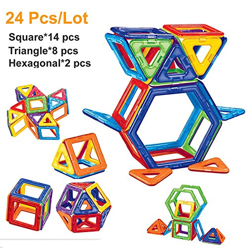 -. Feature : Base Set of Magnetic,24PCS: Square*14, Triangle*8, Hexagonal*2 in assorted rainbow colors endless fun and building, allowing your children to unleash their imagination and creativity and make unique constructions / Made by top brand new ABS + magnetic ,non-toxic,no smell,100% safe for kids / With strong magnetic,in pulling test relaxed 15PCS