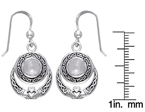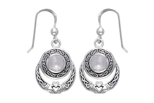 These lovely Celtic earrings feature genuine moonstones in circular settings with a never-ending circle of renewal knot work design. Celtic Claddagh symbols are showcased below the setting. Earrings secure with hook clasps. Complimentary gift box with purchase.Peter Stone© Jewelry Designs are exclusive and protected by Copyright Laws.Feature