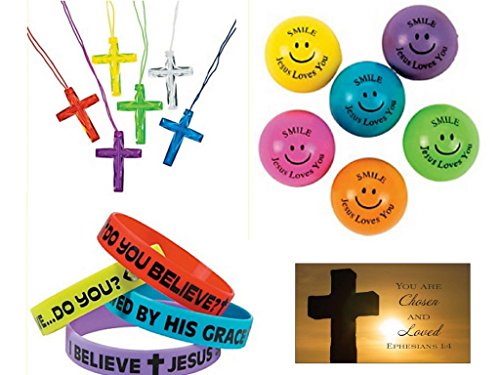 -. Feature : 48 Plastic Bright Color Crystal Cross Necklaces / 48 Assorted Color "Smile! Jesus Loves You" Bouncing Balls / 48 Religious Sayings Bracelet Assortment / Great for P.R.Izes or giveaways at Sunday School, Vacation Bible Camp, Birthdays or Halloween / 1 Inspirational Card with Ephesians 1:4, blank on back, CopyRight BizzyBecca
