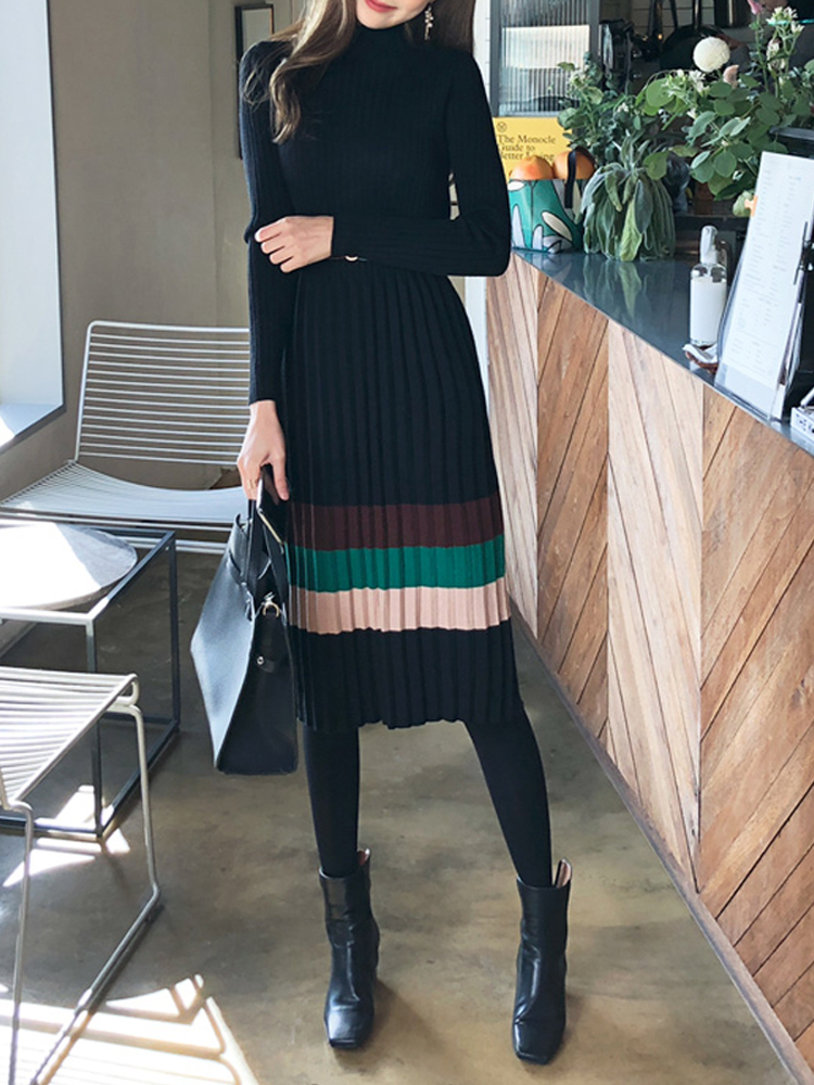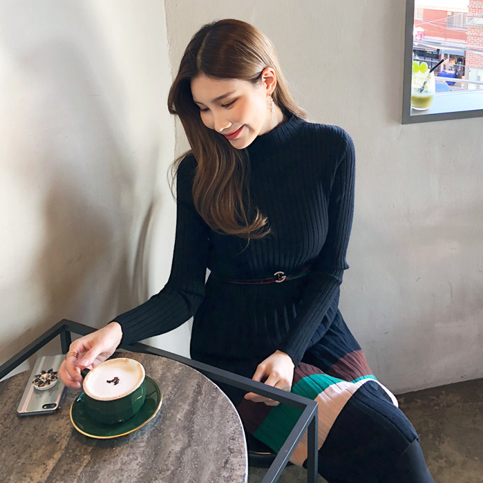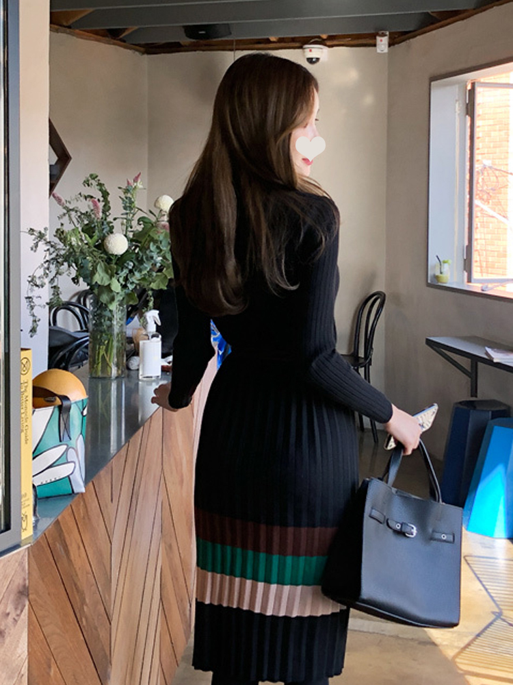 スカートの配色カラーとプリーツ切替デザインが大人可愛いニットワンピース。