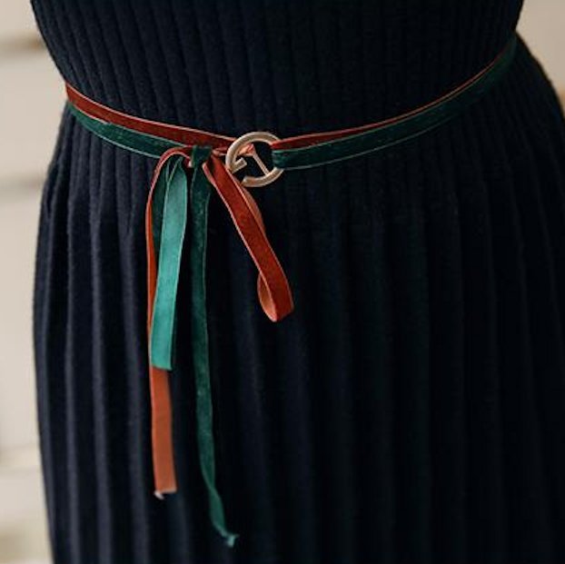 細見え プリーツ リブ ニット ワンピース 膝丈 ミモレ丈 フレア ハイネック リボン モード 大人女子 フェミニン 秋冬 ドレス