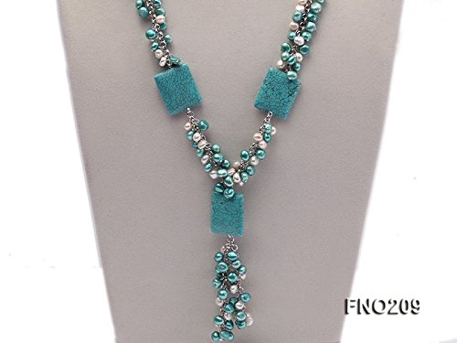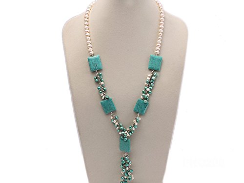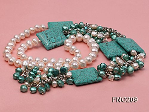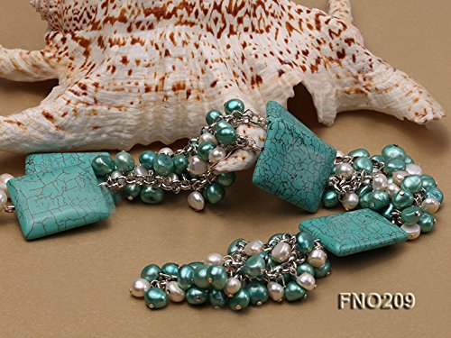 It is hooked with freshwater pearls, turquoise beads with smooth surface as well as crystal.