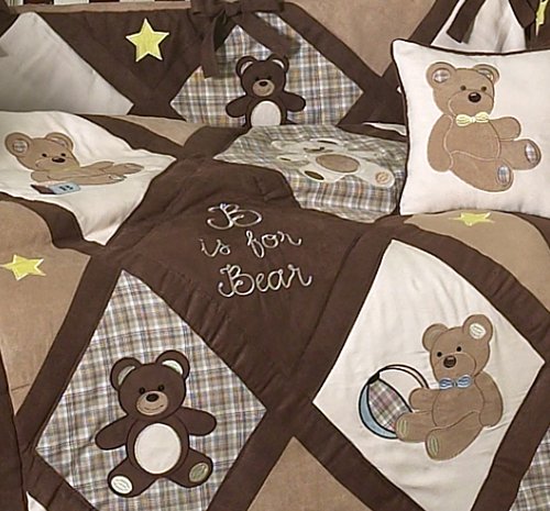 -. Feature : 9 Piece Set Includes: (1)Crib Blanket, (1)Bumper, (1)Fitted Sheet, (1)Skirt, (2)Window Valances, (1)Diaper Stacker, (1)Toy Bag and (1)Throw Pillow / **Sweet Jojo Designs also offers an 11 piece bumperless set / Constructed using patchwork design using teddy bear appliques and embroidered "B is for Bear" / This set is made of 100% cotton and machine washable. / This design has matching accessories such as mobiles, lamp shades, window treatments and wall decor.