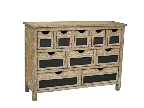 - The rustic finish, along with the chalkboard fronts and hand pull cut-outs, adds to its charm