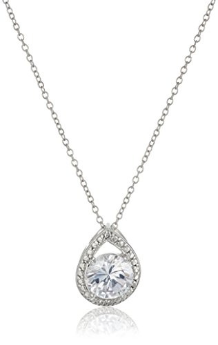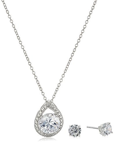 Rhodium-plated sterling silver jewelry set featuring 18" cable chain necklace with bead-frame teardrop-shape pendant encircling cubic zirconia round