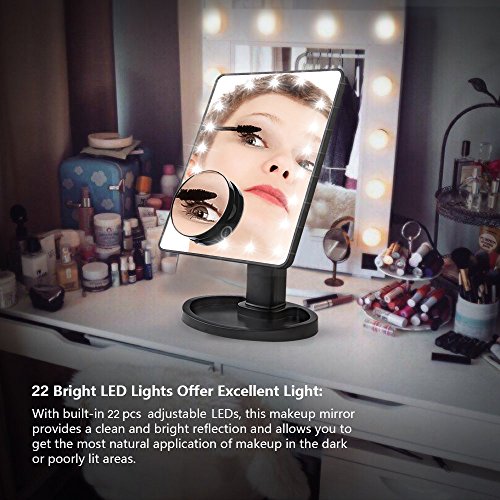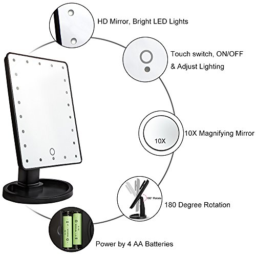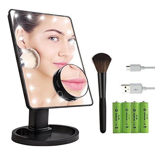 - HOSYO 22 LED LIGHTED MAKE UP MIRROR builts in 22pcs dimmable LED lighted, which allows you to do your make-up in the dark or poorly lit place. Two power supplier methods(USB cable and battery). It comes with 10x Removable Magnifying Mirror, 1x Blush Brush and 4 pack AA batteries and USB Cable. It helps you to get more beauty in your daily life.