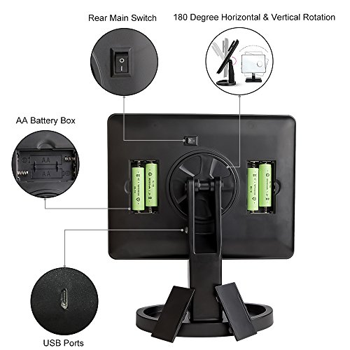- CONVENIENCE STORAGE STAND BASE. The stand base has a groove, where you can place lipstick, make up brush, ear-rings, nail polish, etc. there. And the mirror is powered by batteries and USB Charging, this you make the have more choice for power and convenience to use.