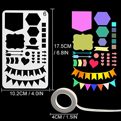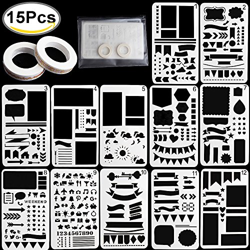 PACKAGE INCLUDED- 15 Pcs in total. 12 * Bullet journal stencil, 1 * Transparent pencil case, 2 * Adhesive tape.