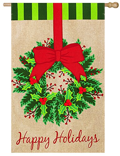 Sleigh bells ring, are you listening? Christmastime is near! Some say that it's the most wonderful time of the year, but that is because of the valuable time we get to spend with loved ones. Give a jolly welcome to friends and neighbors with this festive, seasonal holiday flag. This Burlap Boutique burlap flag is made of medium-weight, soft polyester burlap fabric that has the look and feel of real burlap. Artwork is heat transferred onto both sides of the textured fabric to create a natural, crafted look. The poly-burlap is a durable and weatherproof material that will not fade or fray after continued use. All flags also feature a sleeve at top for use with any standard flagpole or stand, sold separately. This house-sized flag measures 28 inches wide and 44 inches long.Feature