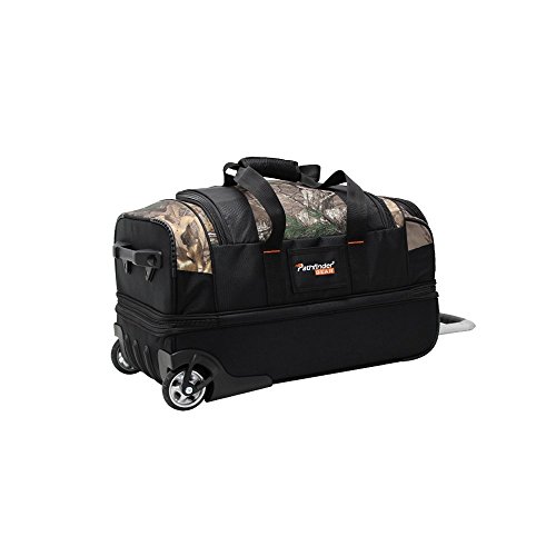 -. Binding : Apparel -. Brand : Pathfinder -. Department : unisex-adult -. Feature : Oversized main compartment with top access and zippered panel separates the lower drop bottom compartment / Heavy duty one touch push-button handle with ergonomic comfort grip. Twin hauling handles and top neoprene handle for easy lifting. / Oversized corner mounted wheels offer maximum durability over all terrain. / Gusset front pocket with 2 separate sections and tie down straps in the bottom compartment. / Red oversized self-repairing coil zippers with T bar pulls for easy use in any element. -. Label : Pathfinder Lage -. Manufacturer : Pathfinder Lage -. PackageQuantity : 1 -. ProductGroup : Apparel -. ProductTypeName : LAGE -. Publisher : Pathfinder Lage -. Studio : Pathfinder Lage -. Title : Pathfinder Gear Realtree 22 Inch Rolling Drop Bottom Duffel