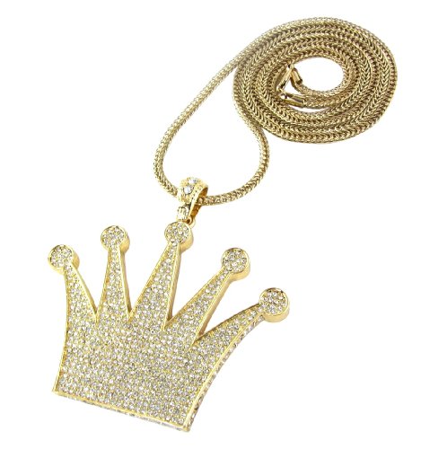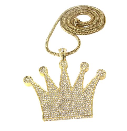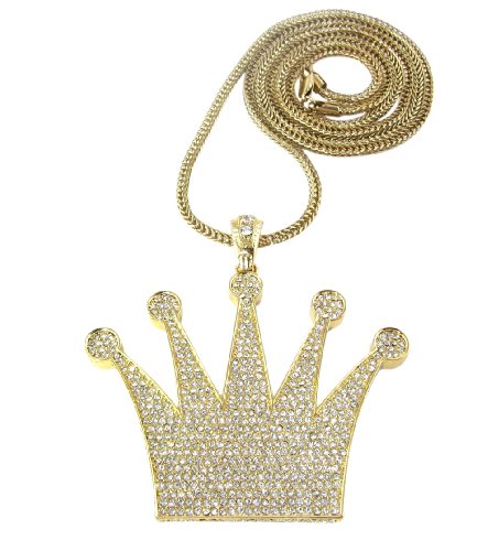 -. Binding : Jewelry -. Brand : Hip Hop Jewels -. Department : mens -. Feature : Iced out hip hop pendant full of cz diamonds and 30" or 36" franco necklace. Check out HIP HOP JEWELS store for other colors. / Pendant made of solid metal and with fancy back cover as seen on celebs. / FAST SHIPPING: Ships within 24 hours or same day if purchased before 3 pm. -. ProductGroup : Jewelry -. ProductTypeName : FASHIONNECKLACEBRACELETANKLET -. Title : Iced Out Gold King's Crown Pendant Piece w/ 30" & 36" Franco Chain