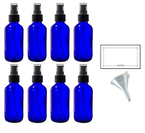 4 oz Cobalt Blue Glass Boston Round Treatment Pump Bottle (8 pack) + Funnel and Labels for essential oils, aromatherapy, food grade, bpa free