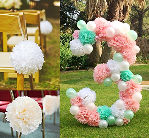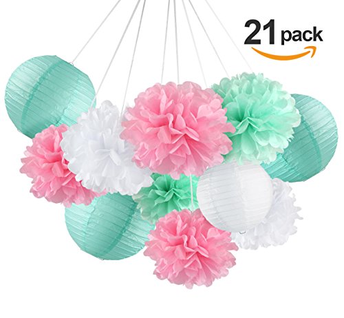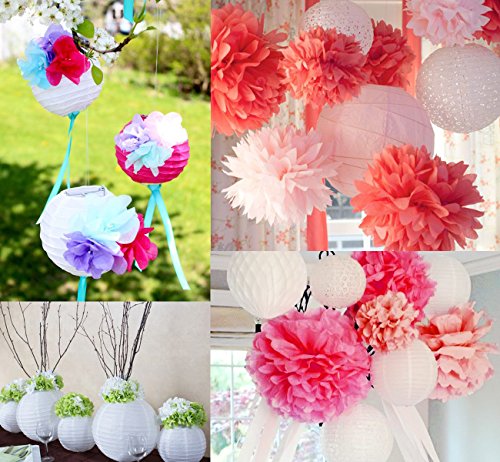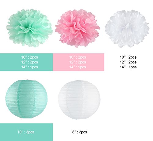 - 21 Pieces Great Value Set: 15pcs colorful tissue paper pom poms in 10 inch (6pcs),12 inch (6pcs),3pcs 14 inch (Larger than most other brands). 6pcs paper lanterns: 3pcs in 8 inch and 3pcs in 10 inch. 3 bright and vibrant colors: white, pink, mint. Warm Tips: No hanging strings included.