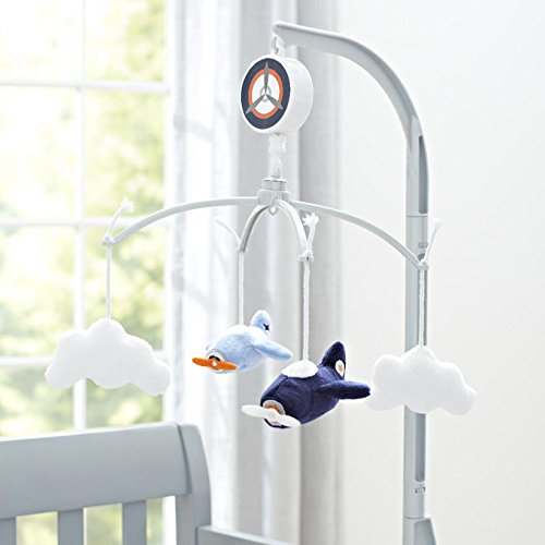 Carter's Take Flight Musical Mobile. This musical mobile will help soothe your little one to sleep, gently spins while playing Brahms Lullaby. Spin and soar into the wild blue yonder with this adorable musical mobile featuring two classic prop planes and two puffy white clouds suspended from a stormy gray fabric covered arm. Coordinates with a full line of Carter's Take Flight Crib Bedding Collection and Room Decor. Other coordinating collection pieces each sold separately.