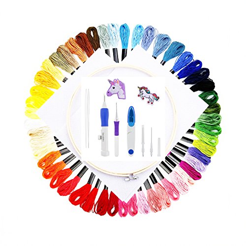 - Embroidery set: includes,50 x cotton cross stitch threads in 50 random colors, 2 x embroidery hoop, 2 x 14 count cross stitch cloth, 1 x seam ripper and 1 x scissors 1 adjustable punch needles, 3 different size needles, 4 threaders and 1 extra magic emmbroidery pen embroidery to meet variety of needs.