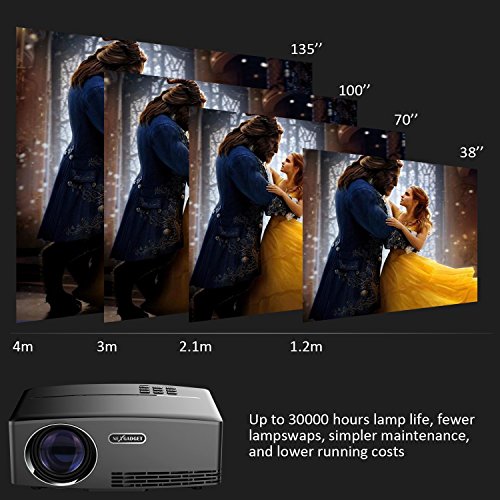 UPGRADE YOUR VIEWING EXPERIENCE: 38”-135” with projector distance 1.2m-4m, 800 x 480 Pixel resolution, you can make the experience even more exhilarating by immersing yourself with a super-sized projected image. Transform your movie nights with our projectors that will unveil the beauty of your favorite films and give you a true cinematic experience at home.