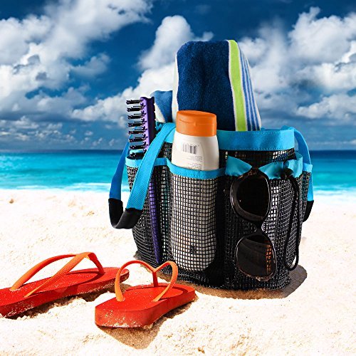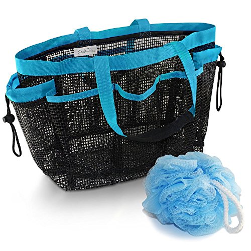 Simply Things Mesh Shower and Bath Organizer with 9 Storage Compartments and Durable Handles and Loofah, Blue