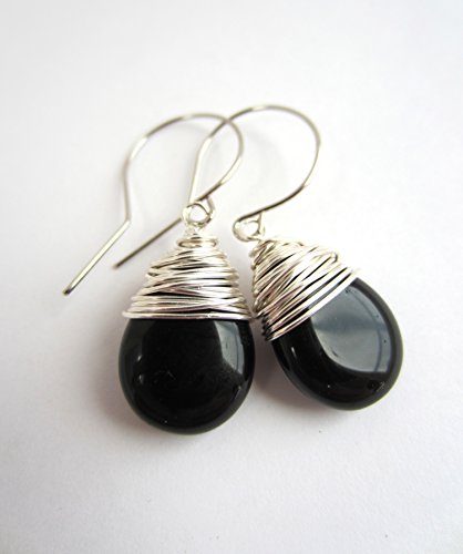 -. Title : Black Wire Wrapped Earrings Czech Glass Drops Silver Tone Wire