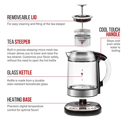 VERSATILE - great for tea, coffee, instant oatmeal and more; has an option to keep water at the desired temperature for up to 60 minutes; bonus tea infuser is included with purchase for brewing your favorite loose-leaf or bagged teas directly in the stain-resistant borosilicate glass kettle