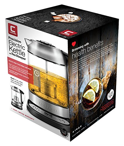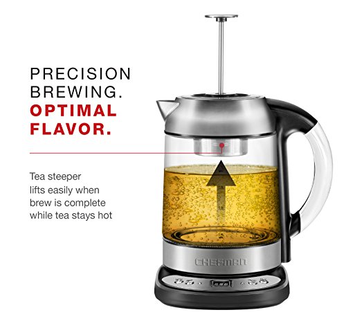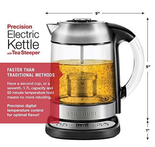The 1500-Watt Chefman Precision Electric Kettle with Tea Steeper allows tea lovers to call all the shots. Precision temperature control ensures each variety of tea can steep at the proper temperature, or remove the stainless tea steeper and use as a traditional electric kettle to boil water quicker than microwave or stove top methods. Other features include LED lighting, automatic shut off, boil dry protection, and a 360 swivel base that allows the kettle to be removed from the base for easy pouring.