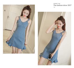 デニムワンピース ミニ丈ワンピース レトロ プチプラ カジュアル ノースリーブ ガーリー フリル ハイウエスト