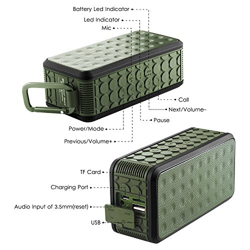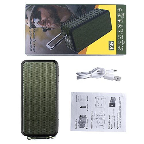 Specifications: Playing Time: 6 hours at 100% volume on a full charge Charging Time: 4 hours Connection Range: Up to 33 feet Charging Current: 500mA Charging Voltage: DC 5V Frequency Response: 100Hz-20KHz Battery: 5V/1200 MAH Bluetooth 4.2 Loudspeaker (O) 40mm Signal-to-Noise:>90dB Loudspeaker Output: 5w*2 THD=10% Audio Selection: AUX in or Bluetooth Speaker Package Include: Bluetooth Speaker*1 USB Charge Cable* 1 ? User Manual * 1 Carabiner*1 How to Connect? 1.ON/OFF Press power key for 2 seconds, then the wireless mode is on. 2. Connect with mobile device Turn on the mobile device and Y6 speaker's wireless mode, then connect "Y6" via Bluetooth on the mobile device.