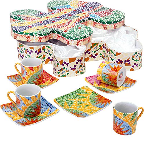 -. Binding : Kitchen -. Brand : Gaudí Barcelona Club -. Color : Modernist Patterns -. EAN : 8413319990825 -. Feature : Set of 4 beautiful cups & saucers. / It comes in an original box with Gaudí's lizard shape. / MADE IN BARCELONA by our Artisans, inspired in Gaudí's Mosaic Pattern / We send it all over the world -. IsAutographed : 0 -. Label : Gaudí Barcelona Club -. Manufacturer : Gaudí Barcelona Club -. ProductGroup : Kitchen -. ProductTypeName : KITCHEN -. Publisher : Gaudí Barcelona Club -. Studio : Gaudí Barcelona Club -. Title : Set of 4 Cups & Saucers Gaudi's Lizard