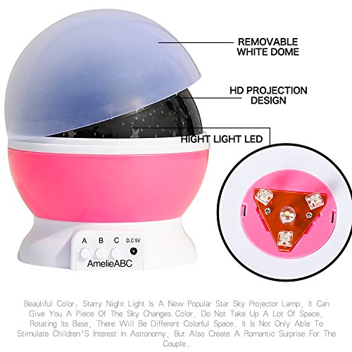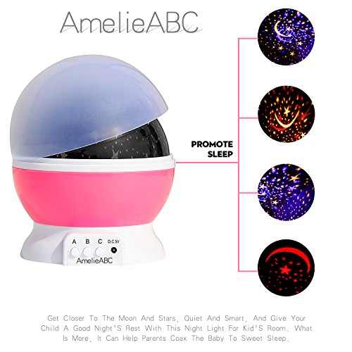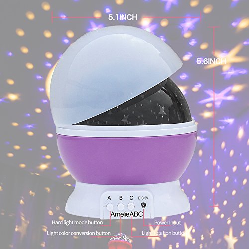 - 3 Lighting Models: Model A - The Nightlight Light (Warm Light), Press A Again Will Shut Off Model A. Model B - Switch For The Color Of The Light.Model C - It Is Rotary Switch (Rotate Or Not Rotate Freely Chosen) [Note: Press C Again Would Shut Off The Rotation]. It Displays An Amazing Display Of Moon And Stars On The Ceiling Of The Bedroom, And Has An Optional Setting For Rotation Or No Rotation As Well.