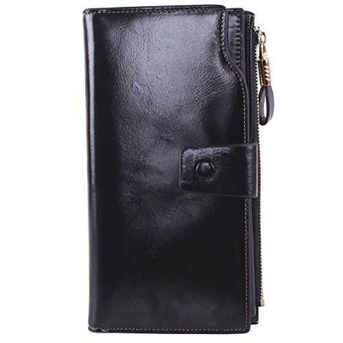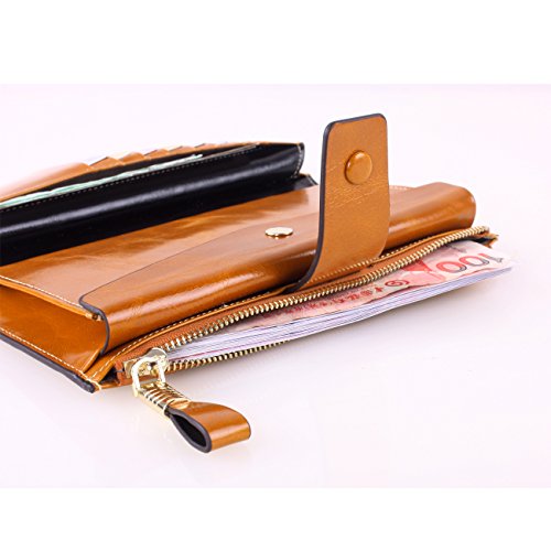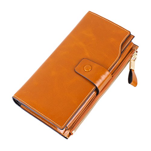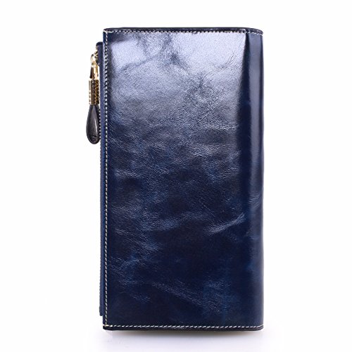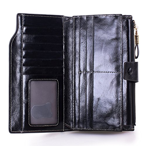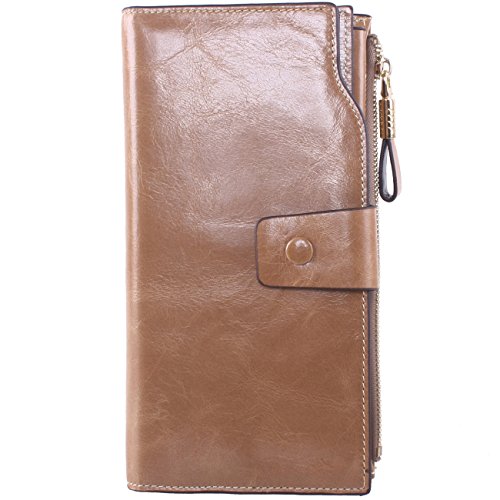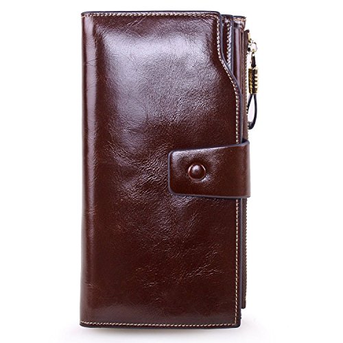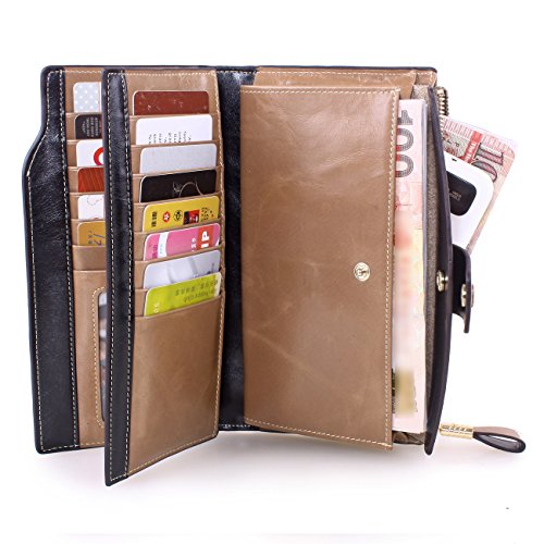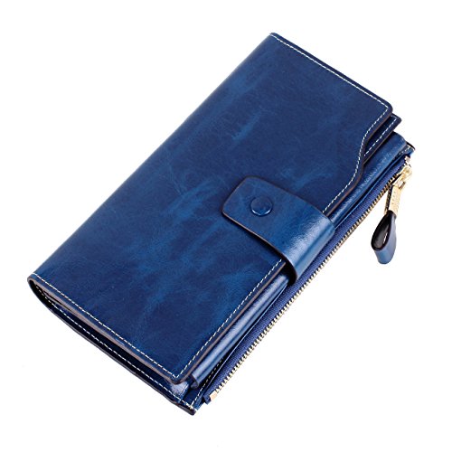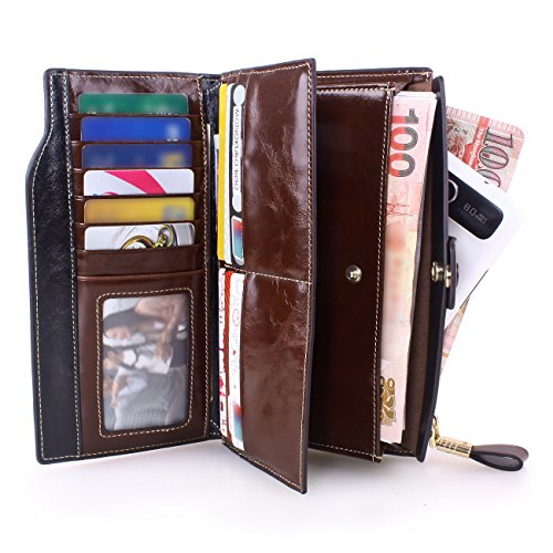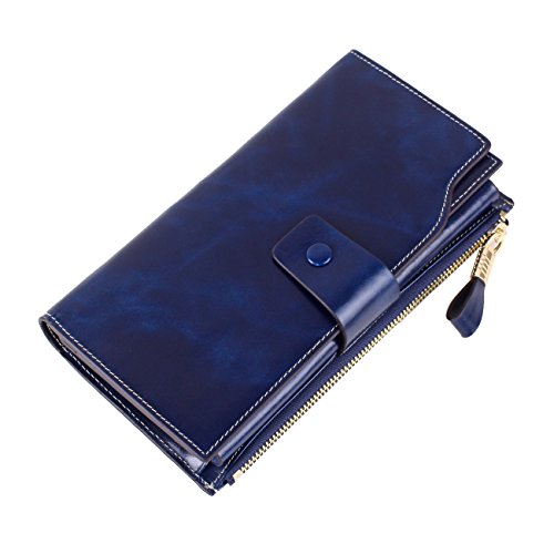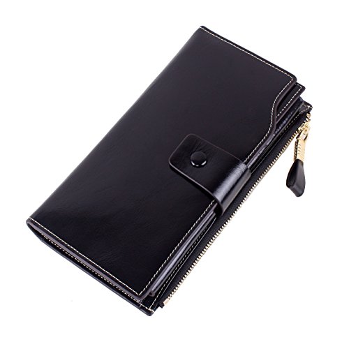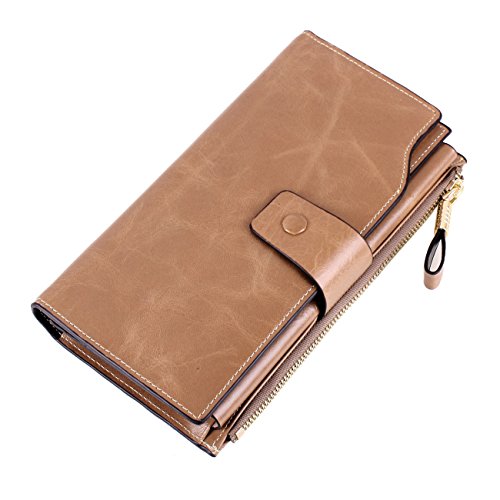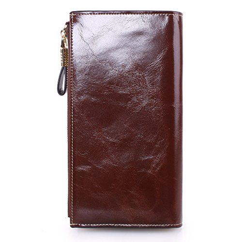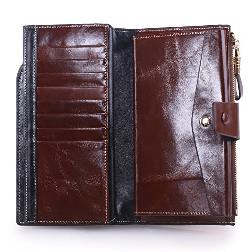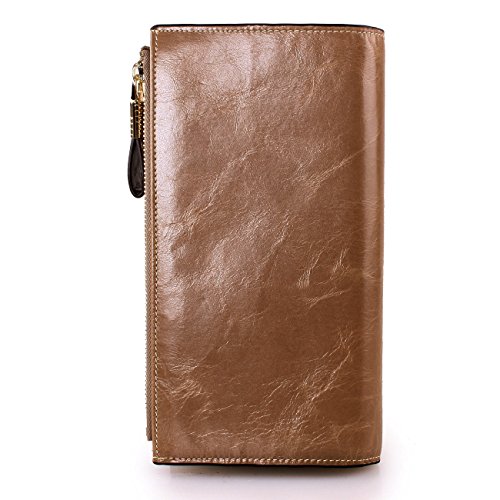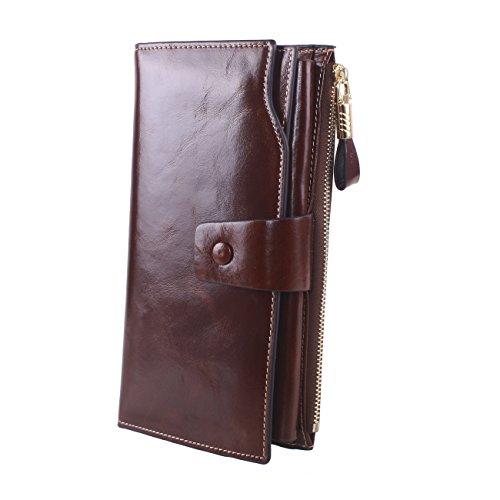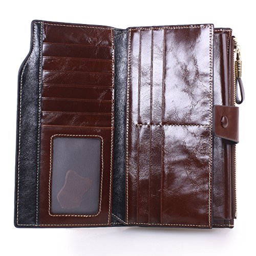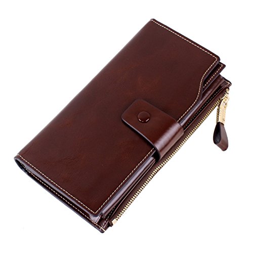 Material: Top grain oil wax cowhide(Genuine Leather) Size: 7.48 x 3.94 x 0.79 inches Weigh: 5.47 ounces Style: OL style Characteristic: Large capacity design. Delicate snap button and zip closure,easy to hold your your phone, cards, bills and money. About the oil waxy leather: Oil wax cowhide is made of top layer leather which is seems more shiny or glossy after the process of superficial by burnishing, oiling and waxing, just like add wax oil into leather. It is a fashion craftwork of leather with vintage artistic effect. This wallet is made of Oil wax cowhide, which has many irregular wrinkles, and clear texture. This is natural leather texture formation, also is the characteristics of Oil wax cowhide. The longer the better, the leather will be more luster; the more likely they were to have lasting appeal. How to maintain the leather bag: Keep your Oil wax cowhide product away from WATER, OIL STAINS; because Oil wax cowhide has strong Water absorption and oil adsorption. If the surface of Oil wax cowhide product has light scratching, just used soft cloth clean it repeatedly. If the surface of Oil wax cowhide product has Stains, just used colorless wax oil daub and clean it. The real color of the bag may be slightly different between the photo and the actual item shown on website caused by many factors such as brightness of your monitor and light brightness. It is totally normal for any mistake owing to munual measurement.Cowhide material has natural leather smell,but it will be disappear after you use in a few days. 0