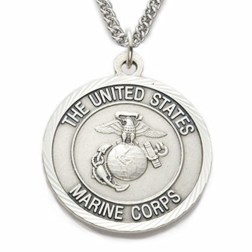 -. Binding : Jewelry -. Brand : TrueFaithJewelry -. Department : womens -. Feature : Medal - Sterling Silver - 1 Inch (Dia) / Chain - 24 Inch Stainless Steel with Rhodium Finish - Lobster Claw Clasp / Comes in Jewelry Gift Box -. Label : TrueFaithJewelry -. Manufacturer : TrueFaithJewelry -. ProductGroup : Jewelry -. ProductTypeName : FASHIONNECKLACEBRACELETANKLET -. Publisher : TrueFaithJewelry -. Studio : TrueFaithJewelry -. Title : Sterling Silver 1" U.S. Marines Corps Medal w/ St. Michael on Back on 24" Stainless Steel Chain