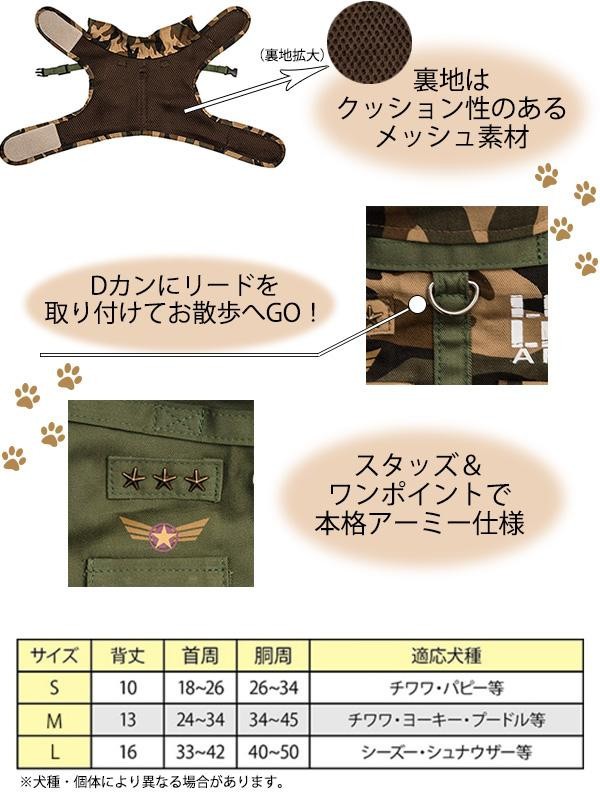 | かっこいいミリタリー風ハーネス!裏地はクッション性のあるメッシュ素材で、スタッズ&ワンポイントの本格アーミー仕様です!Dカンにリードを取り付けてそのままお散歩へGO♪ |