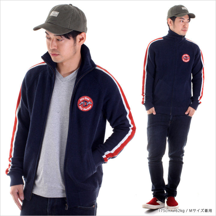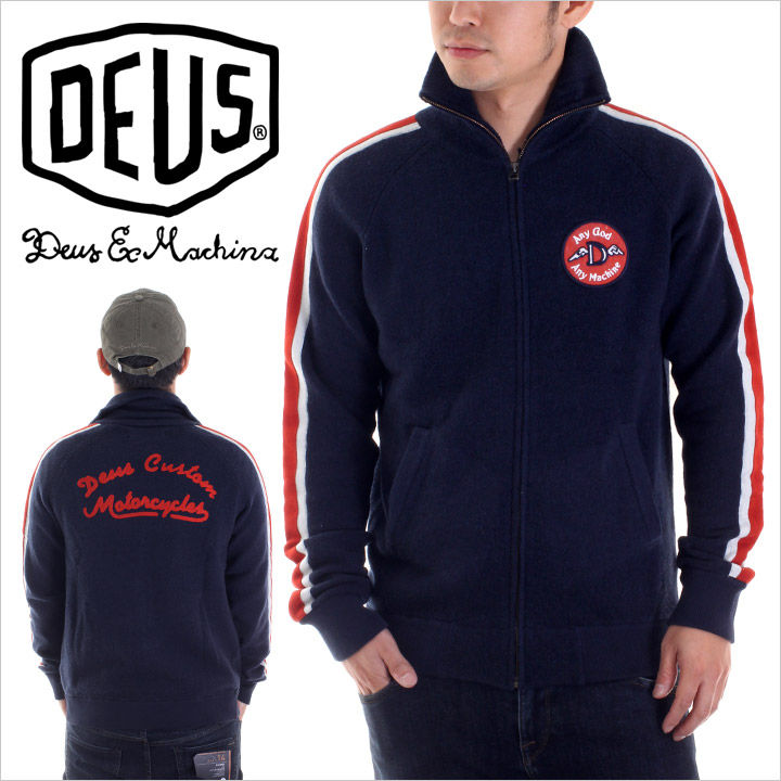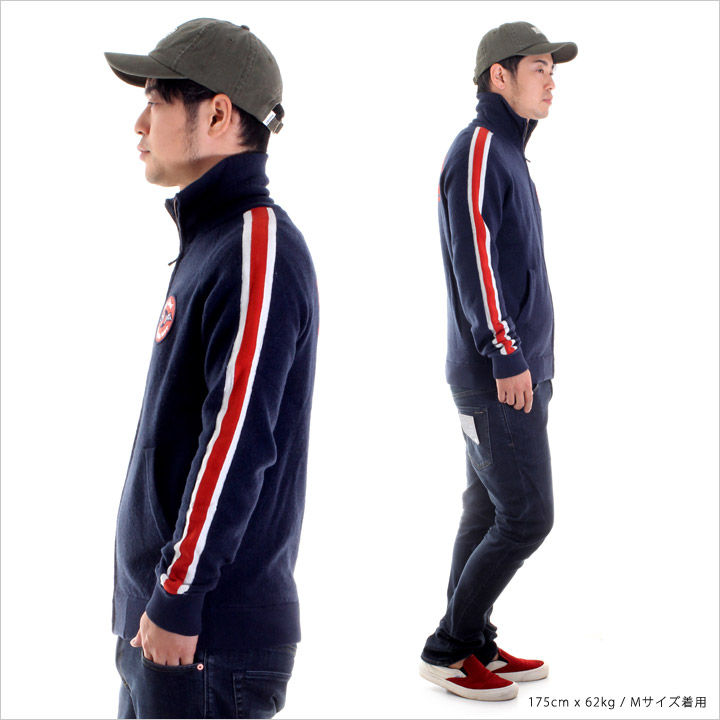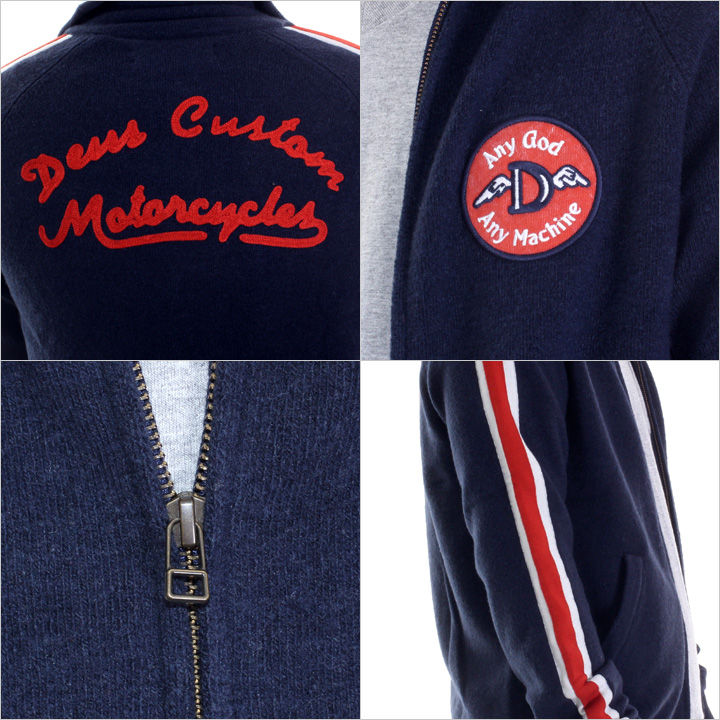 スポーティーなシルエットが魅力のニットジャケット。 印象的なレッド&ホワイトのラインを両袖に施し、インパクト抜群のバック刺繍ロゴなどDEUSファン垂涎のデザインに思わず目線を奪われてしまう一着。 深みのあるネイビーを基調にしたカラーリングで、デニムやカラースキニーなど幅広いパンツとの相性も良く、ワンランク上のカジュアルコーディネート楽しめるオススメアイテムです。 また、コットン混合素材でウール独得のチクチク感も緩和され、大人好みなストレスのない着用感も味わえます。