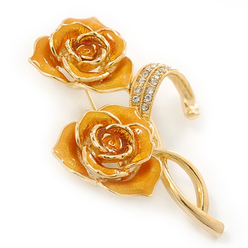 -. Title : Gold Yellow Enamel, Crystal Double Rose Brooch In Gold Plating - 65mm Length
