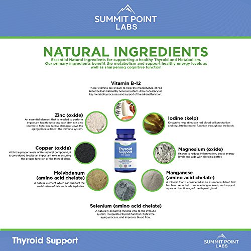 Are You Sick Tired of Being Sick Tired? Let the power Summit Point Labs, Advance Formula Thyroid Support be your go to for a happier, healthier you! Made with 14 Premium Natural Ingredients. Our primary ingredients benefit the metabolism and support healthy energy levels as well as sharpening cognitive function. Advanced Formula to support Healthy Thyroid Metabolism Vitamin B-12 - Primary ingredient to benefit the metabolism and support healthy energy levels as well as sharpening cognitive function. Iodine (kelp) - Known to help stimulate red blood cell production and regulate hormonal function throughout the body. Magnesium (oxide) - Known to reduce inflammation, boost energy levels and aids with sleeping better. Zinc (oxide) - An essential element that is needed to perform important health functions each day. Selenium (amino acid chelate) - A naturally occurring mineral vital to the immune system; It regulates thyroid function; fights the aging process, and improves blood flow. Copper (oxide) - With the proper levels of this natural compound, it is considered to play an important role in ensuring the proper function of the thyroid gland. Manganese (amino acid chelate) - A mineral that is considered as an essential nutrient that has been reported to reduce fatigue levels, and support a proper functioning of the thyroid gland. Molybdenum (amino acid chelate) - A natural element which can support the metabolism of fats and carbohydrates. L-Tyrosine Schisandra Powder (fruit) Ashwagandha Root Powder Bladderwrack Powder (thallus) Cayenne Pepper Powder (fruit) Kelp Try Out Our Supplement NOW, See ? And Feel ? The Amazing Results Yourself! 0 |