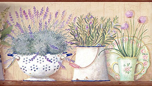 -. Title : Wallpaper Border Green Lavender Flowers in Pitchers & Bowls on Shelf Brown Trim