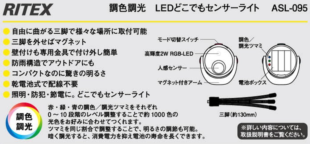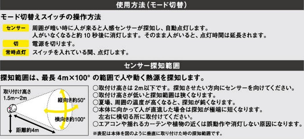 (Lit in seconds), off, always on Battery life Sensor mode (approx.): 120 days (when lit 10 times a day) Always on mode (approx.): 5 hours Installation location: indoor / outdoor (rainfall standard IP 43) /