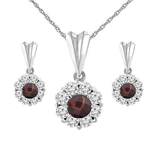 -. Title : 14K White Gold Natural Garnet Earrings and Pendant Set with Diamond Halo Round 4 mm