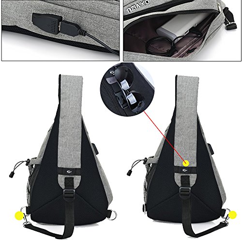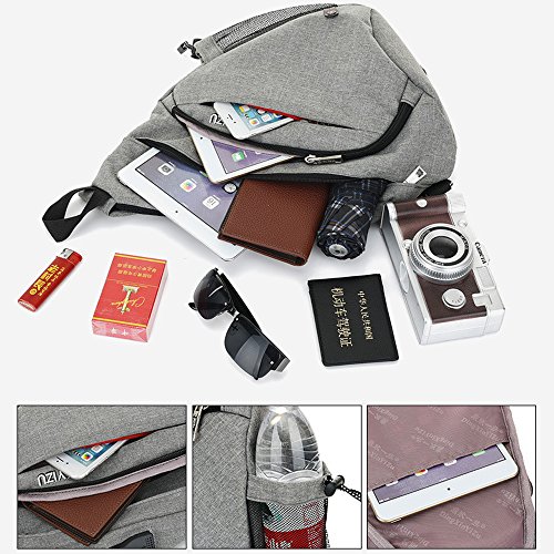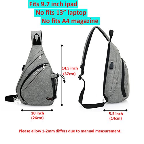 -. Feature : FASHION FUCTION--External USB with built-in charging cable offers a convenient charging of your electronic device anywhere, and this bag do not include a battery, you need a power bank to charge it. / Unbelievable Storage--No other bag has this many compartments! Plenty of room for gadgets, books, water bottle & 9.7" ipad. Easy access to small items. / Stands Tough Against Wear & Tear--Made of durable, water-resistant polyester canvas with top-quality zippers and durable strap clip. / COMFORTABLE TO WEAR--Padded ventilating back with ergonomic design for comfort. Adjustable padded single shoulder strap allows this bag to fit most people. Easily Changeable Strap Direction according to your preference. / NOTE--SIZE:14.5 x 10 x 5.5 inches (H x L x W),can hold 9.7" iPad or small Tablets up to 8" ( Will Not fits Laptop).