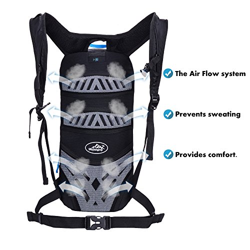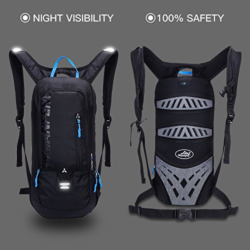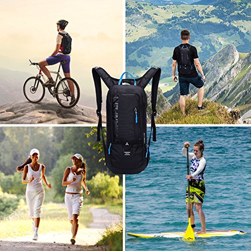 -. Feature : ✔Totally Practicality:Multiple pocket storage and organization,there is a spacious master cabin with a built-in 2L replaceable bladder that allow you to carry your water conveniently.Another number of internal pockets are smart phones, pencil bags and so on,External zip pocket save small accessories as keys, etc. / ✔High Quality Material:This hydration pack measures 18in x 8.6in x 7in and weighs only 17.3 ounces.Made of ultralight waterproof tear resistant nylon fabric,designed to keep you cool and dry while on your outing.Very attractive,comfortable and durable. / ✔Adjustable Straps:Bearing system with breathable material, adjustable padded shoulder straps for comfort, chest strap and waist strap to fit your need. / ✔Design for Biking/Skiing: The 10l mini Cycling Rucksack has ergonomic design on the back for maximum breathability and comfort. Integrated breathable mesh pad in the back,breathable and not my. Reflective strips for safe riding at night. / ✔Must Equipment for Outdoor Sports:Lightweight suitable for outdoor activities like outdoor, running camping mountain climbing, hill walking, cycling, rock-climbing and hiking, etc.