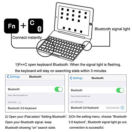 Intelligent Switch:auto wakeup and sleep function for turn on/off. Shortcut key Fn+C can open bluetooth,click bluetooth singal on the ipad for pairing.Get rid of old complex pairing,more convenient and quick.