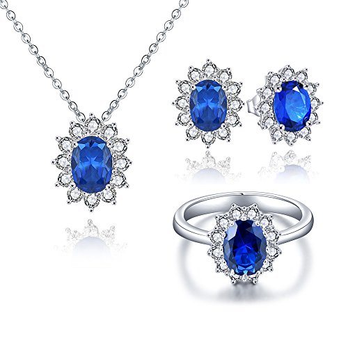 -. Binding : Jewelry -. Brand : YL -. Department : womens -. Feature : Three-piece set includes sterling silver pendant necklace, earrings and rings / Tri-piece ring earrings pendant necklace set each featuring center inset with oval-shaped created sapphire with cubic zirconia / Created sapphire is a sapphire, but it is made in a lab, with flame fusion, flux melt method or hydrothermal instead of a natural sapphire that is mined from certain types of rock. / Cubic zirconia is widely used in jewelry. The high quality Cubic Zirconia is an affordable diamond alternative that could reveal brilliant shine and a meticulous cut. / Come with a gift box and shipment may cost 7-15 days in normal. Please be patient after payment. -. Label : YL Jewelry -. Manufacturer : YL Jewelry -. ProductGroup : Jewelry -. ProductTypeName : FASHIONOTHER -. Publisher : YL Jewelry -. Studio : YL Jewelry -. Title : YL Sterling Silver Blue Created Sapphire Jewelry Set Royal Princess Diana CZ Pendant Necklace Stud Earrings Ring