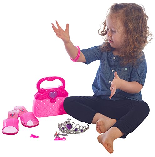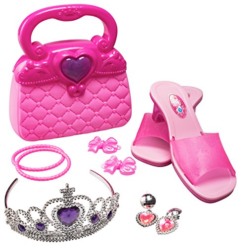 Beauty set includes a cute pink purse with matching shoes, 2 bracelets, 2 earrings, 2 hair barrettes and a beautiful Tiara with rhinestones to complete the ultimate princess look.